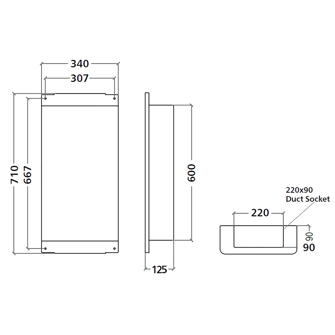 Duct Compatibility – Features 220x90mm duct connectors, adaptable to 150mm round ducts using additional adaptors.