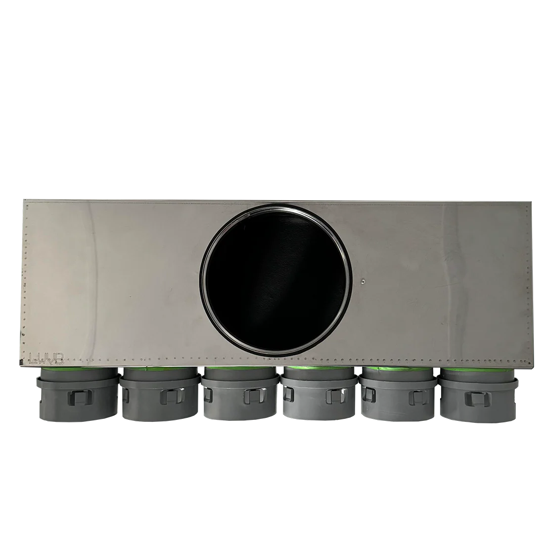 The Quiet-Vent Pro 6 Point Top Entry Distribution Box is a high-performance solution designed for seamless air distribution. Made from robust stainless steel, it ensures exceptional durability and is built to withstand diverse operating conditions. The innovative CLICK system simplifies the installation process, while the insulated interior optimizes airflow and energy efficiency.